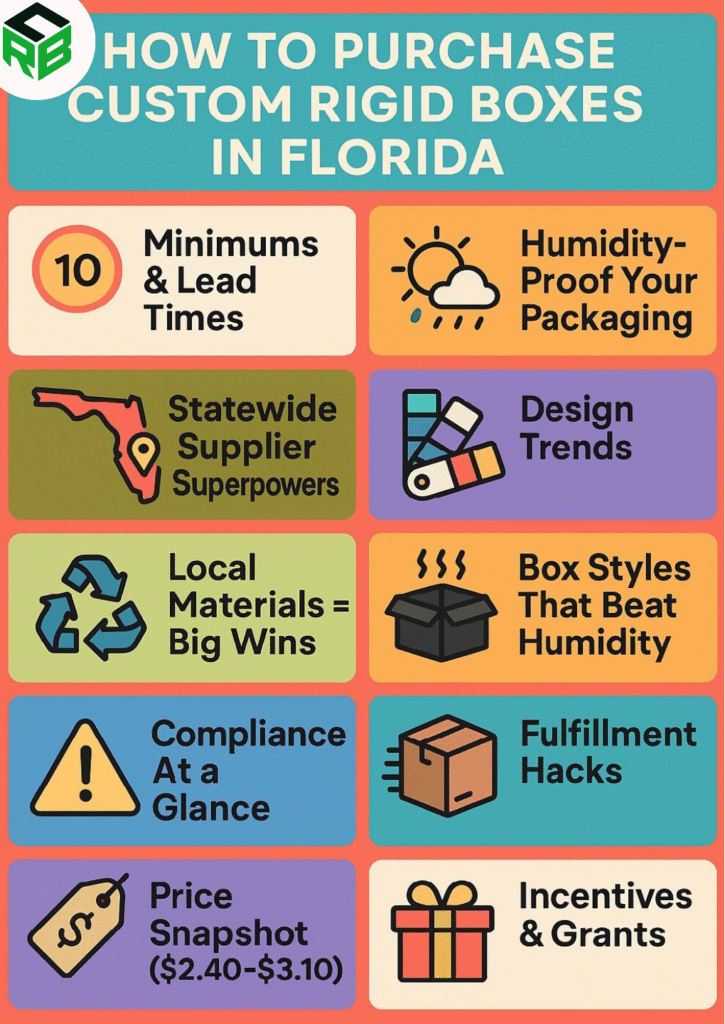 The Sunshine State teems with brands that sell beauty goods, cigars, craft rum, hand-poured candles, and vacation souvenirs. Every product begs for packaging that looks premium, stands up to tropical weather, and ships fast. Florida hosts 2.8 million small businesses, the third-highest total in the United States. To overcome this competition, you need premium rigid packaging. This Florida Custom Rigid Boxes Purchasing Guide can serve you well in this regard.